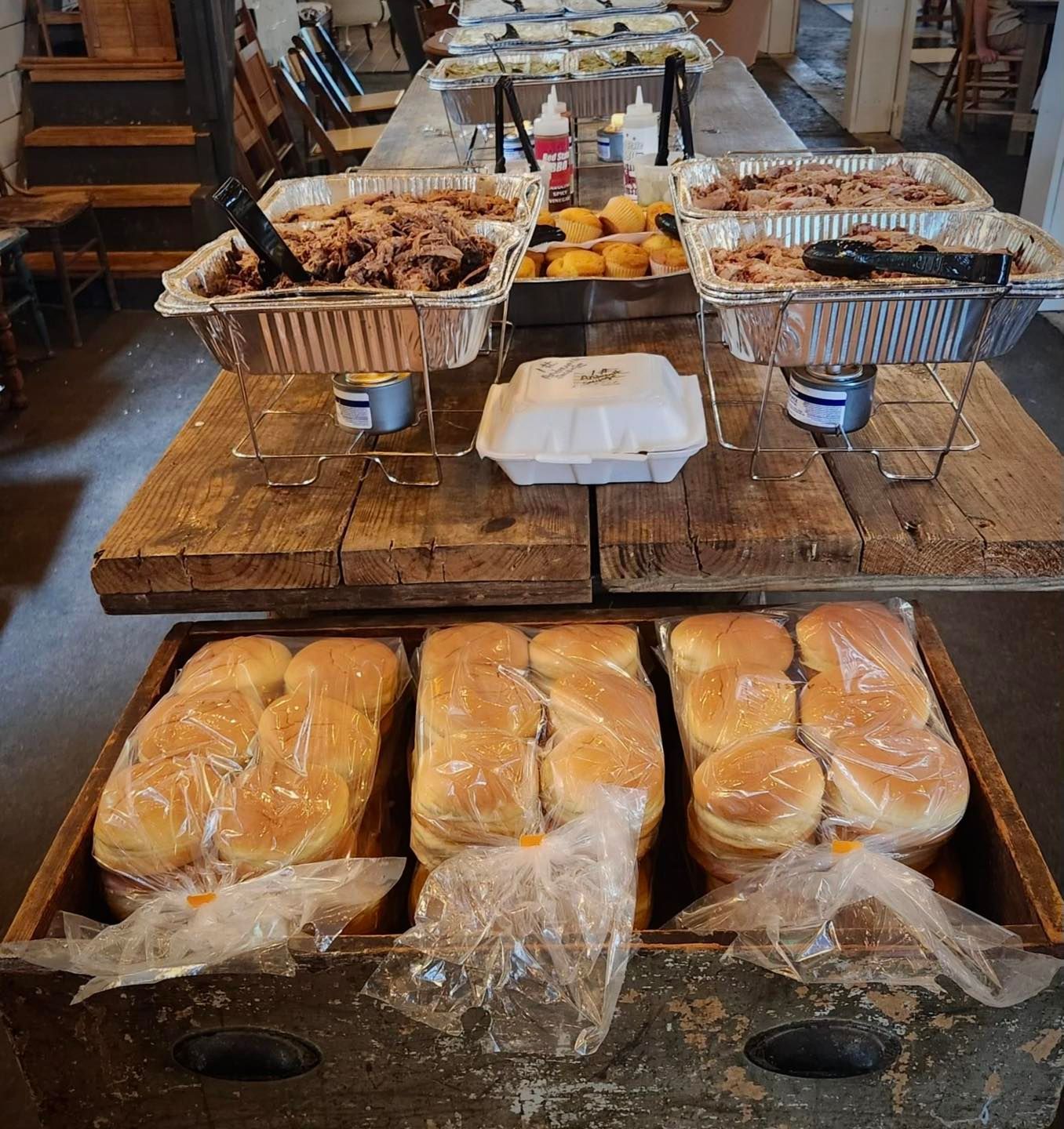 48 wings, 1 pint buffalo, 1 quart ranch/bleu cheese, 5 pounds of meat of your choice (pork, brisket or chicken) 2 half pan sides, 2 pints sauce, 16 oz beer cheese with crackers, 24 buns